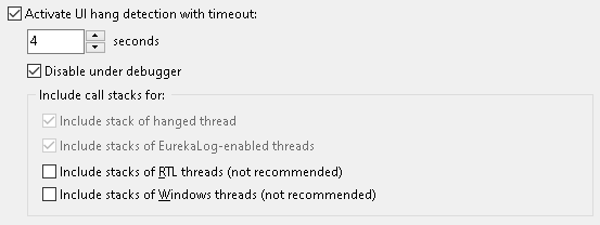 1. "Activate UI hang detection with timeout" option enables EurekaLog to monitor running application for hangs. A timeout (in seconds) indicate how long UI must be unresponsive to be detected as "hang".