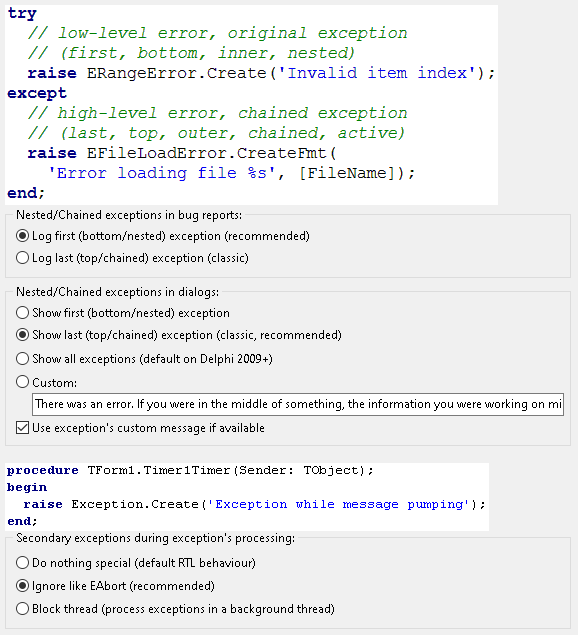 try raise ERangeError.Create('Invalid item index'); // <- low-level error (a.k.a. original, first, bottom, inner, nested, root) except raise EFileLoadError.CreateFmt('Error loading file %s', [FileName]); // <- high-level error (a.k.a. introduced, last, top, outer, chained) end;